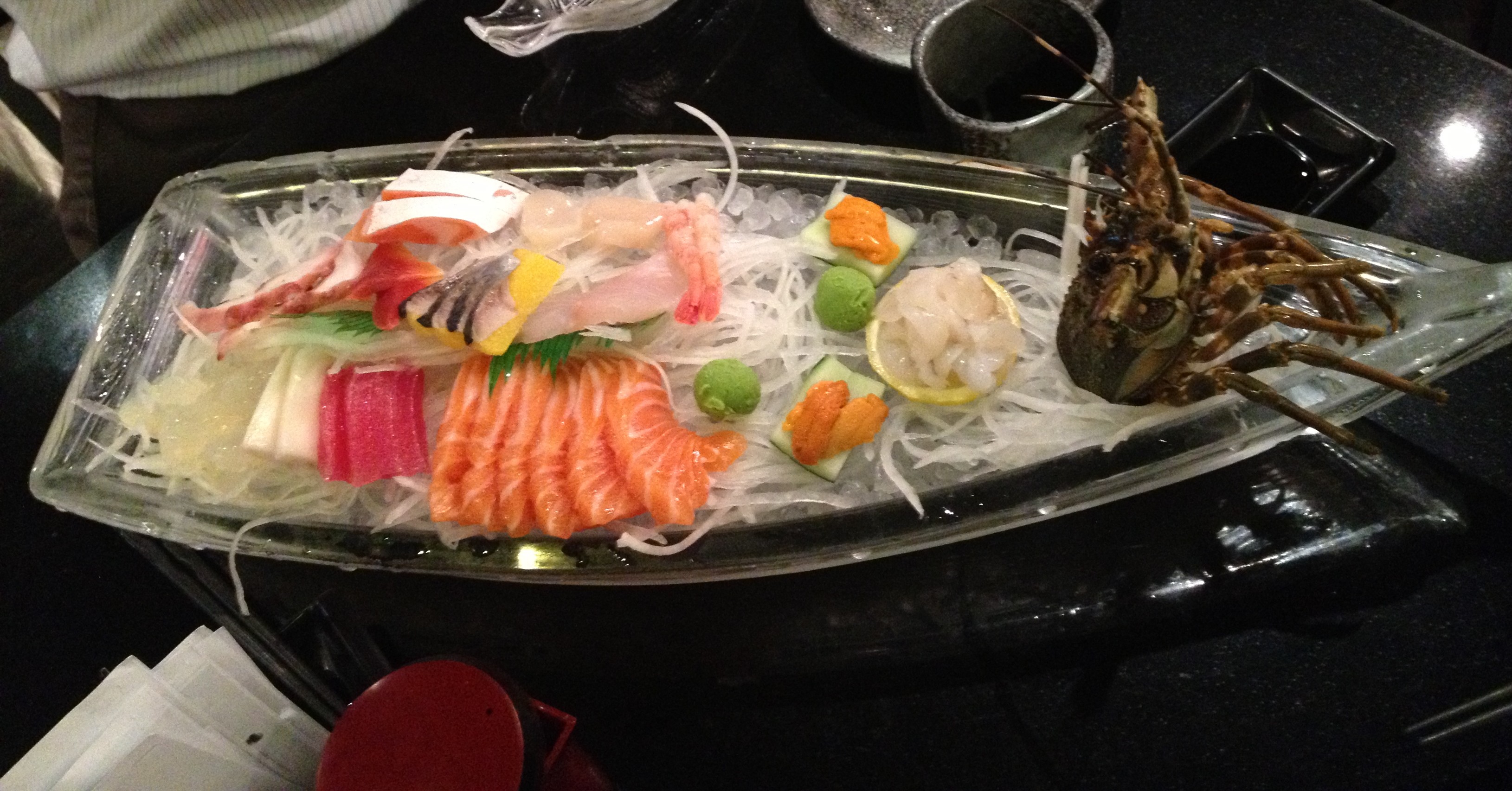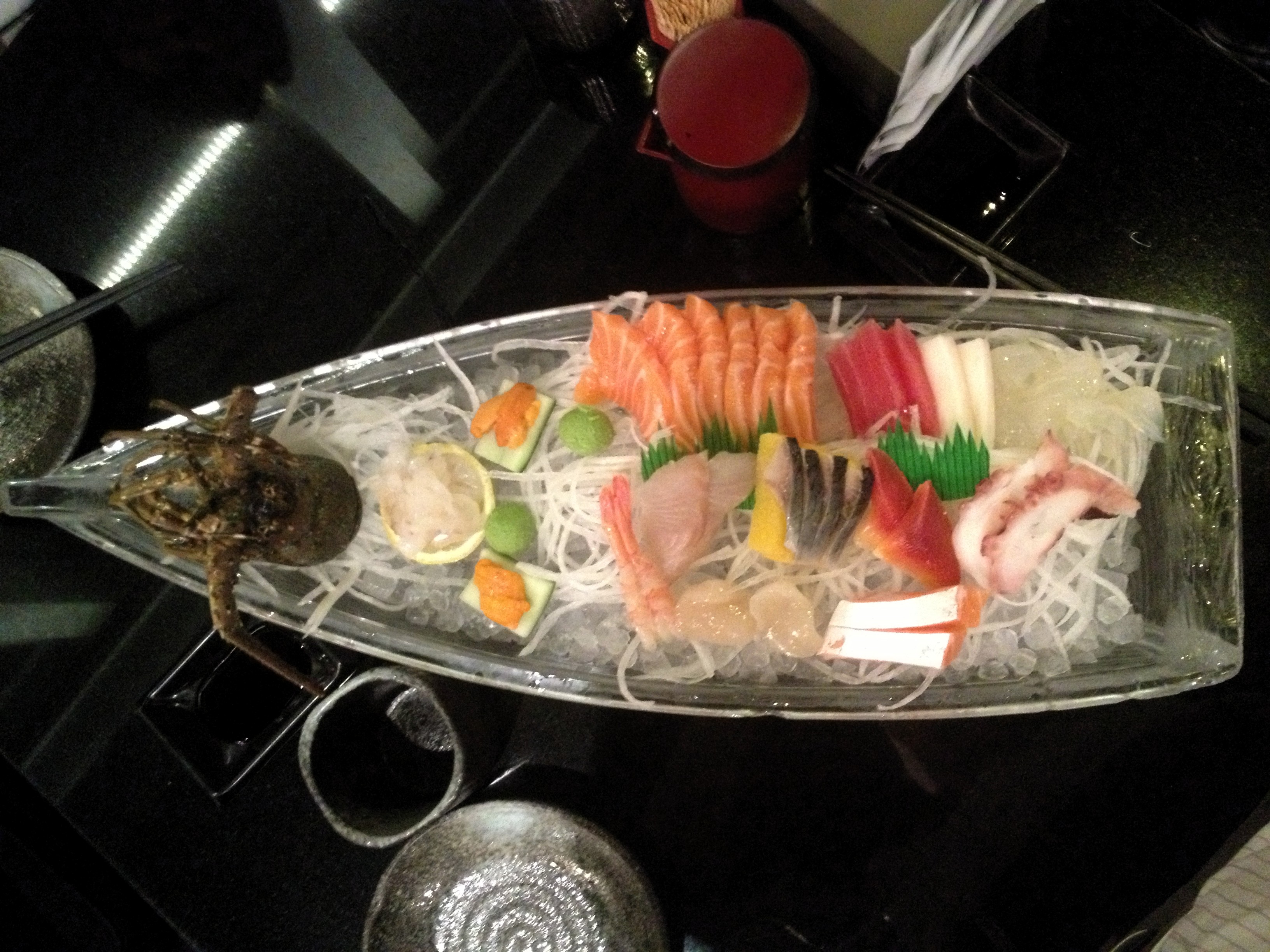 刺身船:龍蝦、三文魚腩、三文魚、活帶子、甜蝦、活水母、白玉豚、海膽、八爪魚、希靈魚、金槍魚、活魚、北寄貝