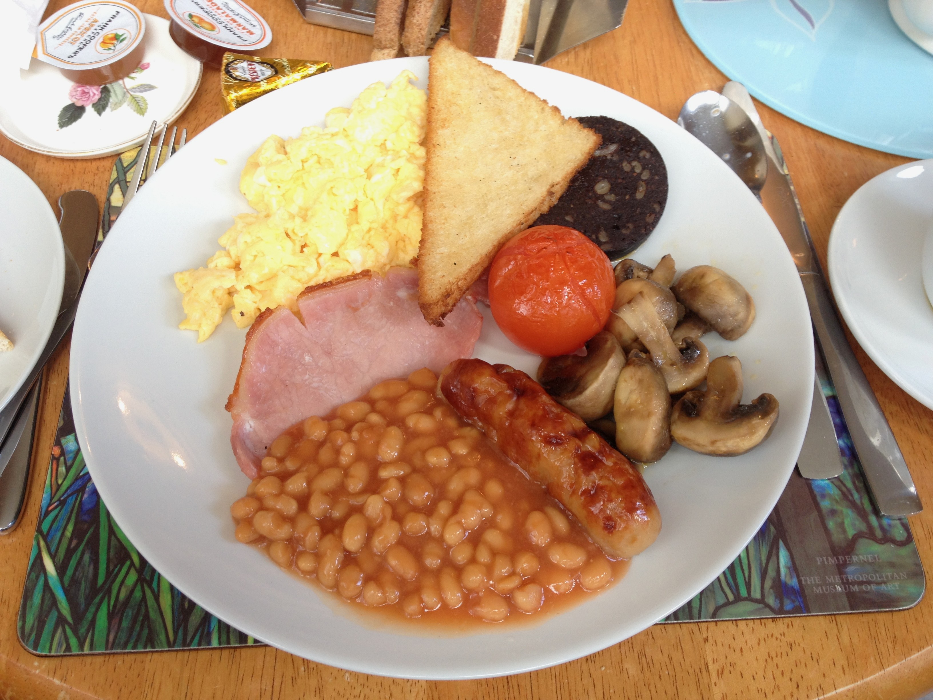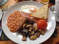 烤培根、香腸、黑布丁、炒雞蛋、香菇、豆、番茄、炸麵包
