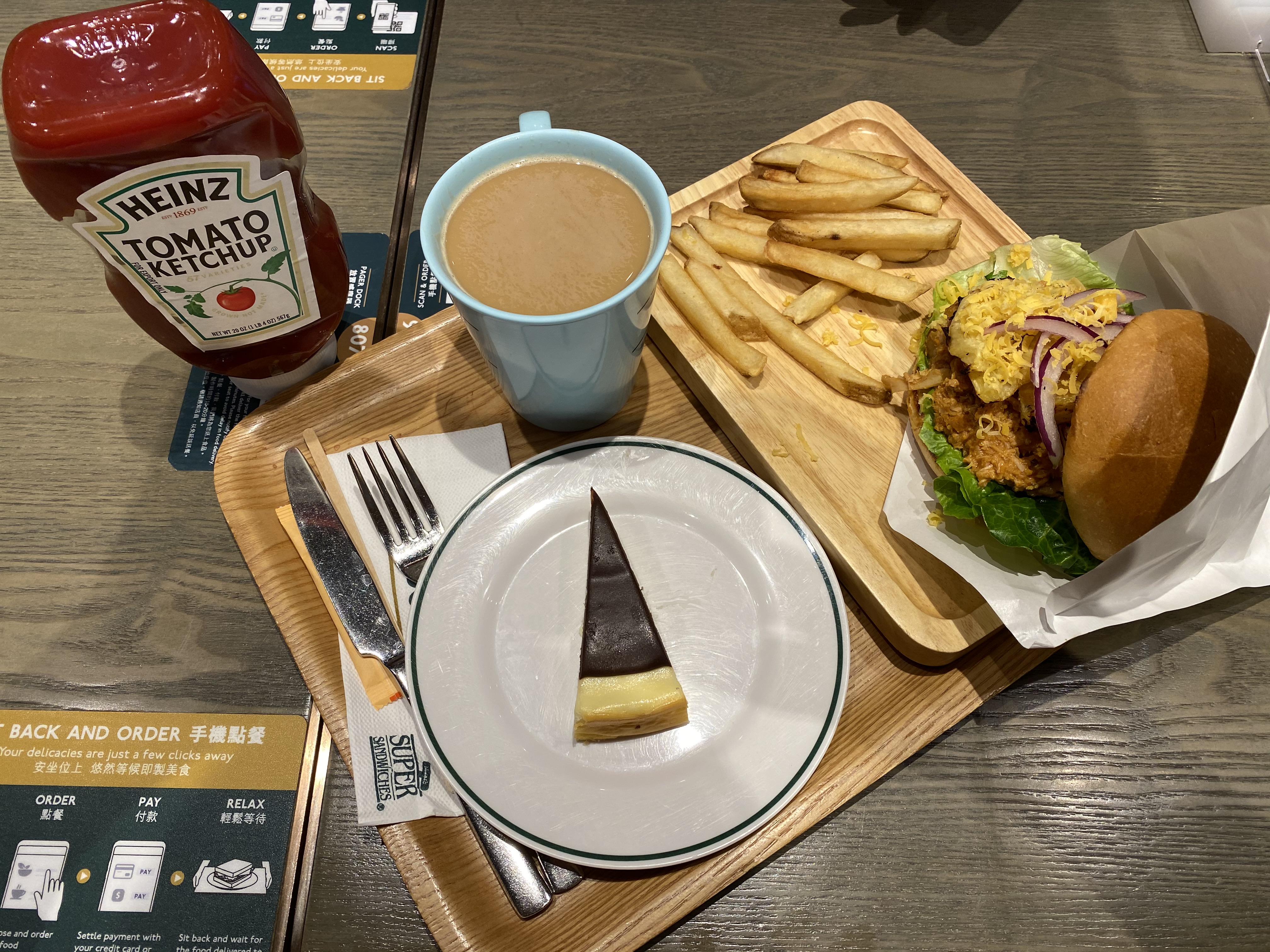燒烤汁雞肉、鮮菠蘿、車打芝士漢堡配薯條、熱即磨咖啡、朱古力芝士餅