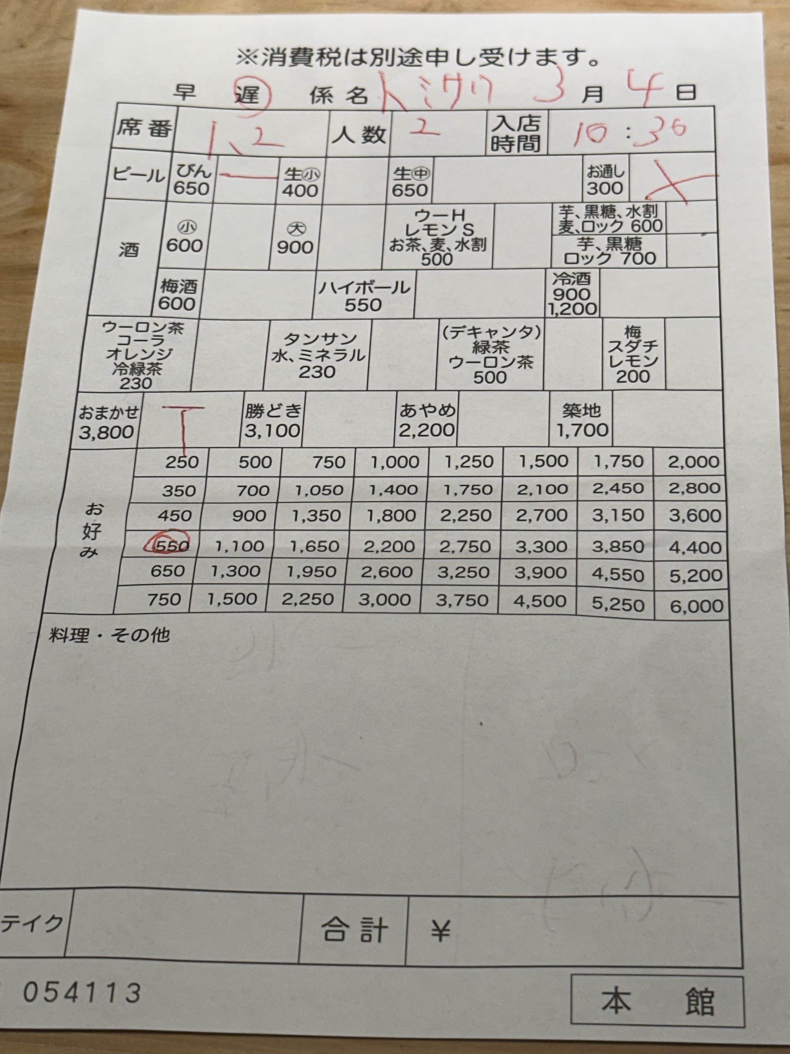 發票: ビール(Beer)、お通し(Otoshi)、おまかせ(Omakase)