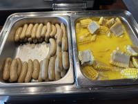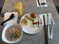 蒸腸粉、熟蛋、牛油粟米、雞肉腸、綠豆粥、橙汁
