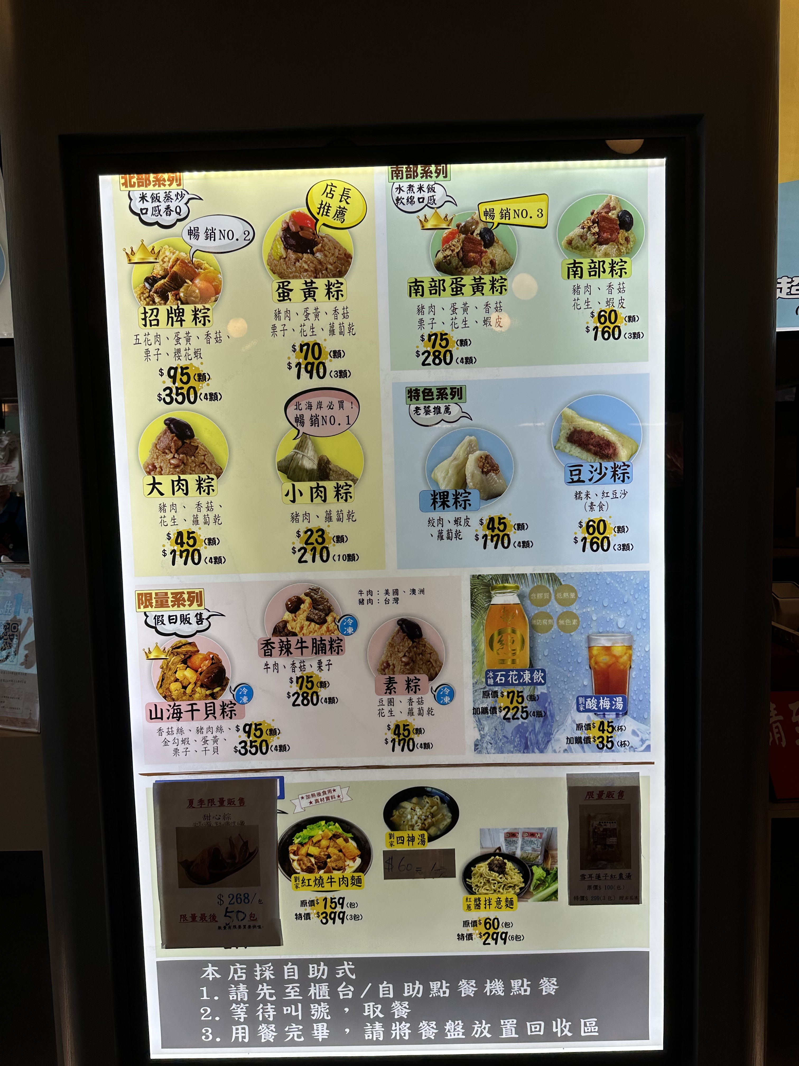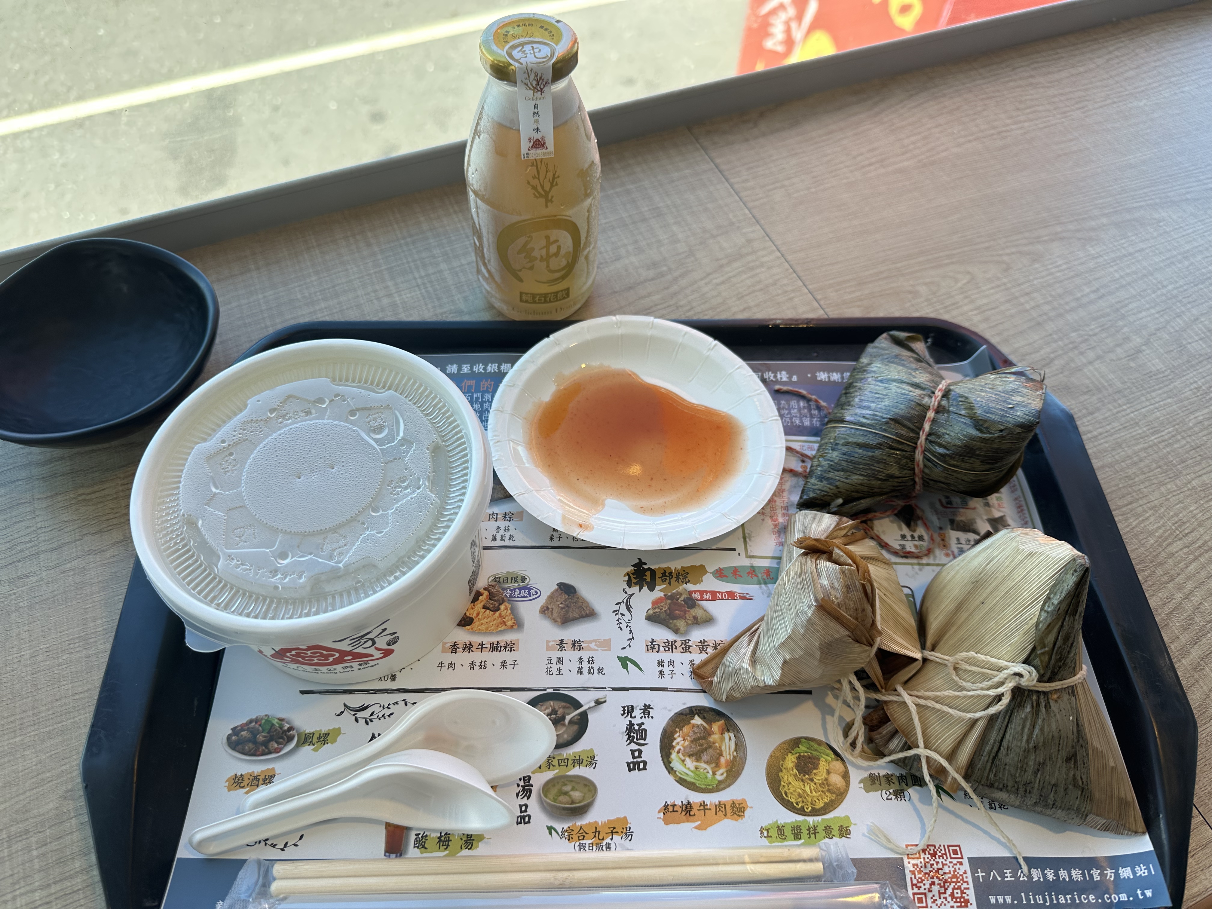 2/F餐廳: 南部粽、小肉粽、招牌粽、冰糖石花凍飲、劉家四神湯