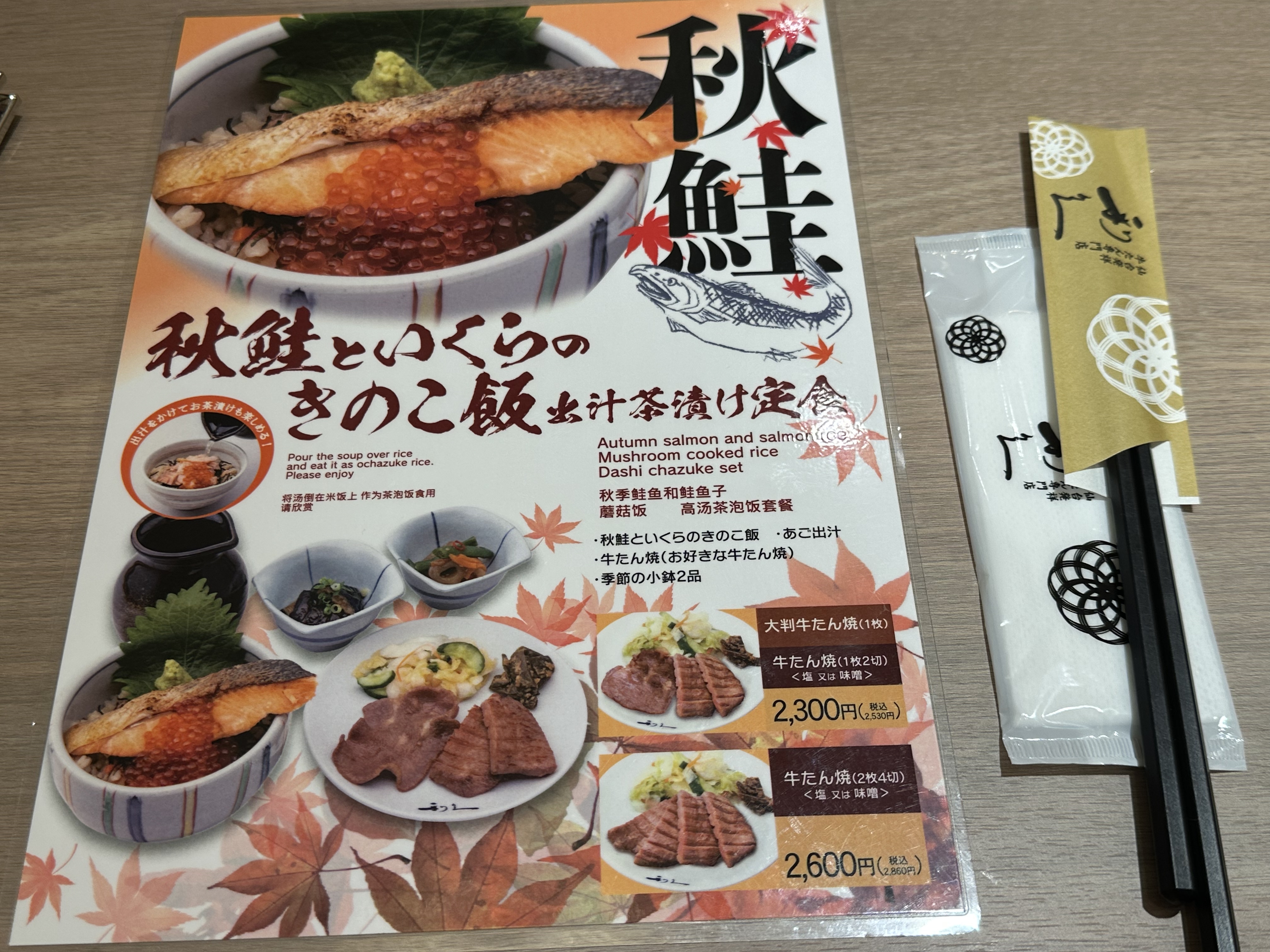 秋鮭といくらのきのこ飯出汁茶漬け定食 (秋鮭といくらのきのこ飯、大判牛たん焼、牛たん焼)