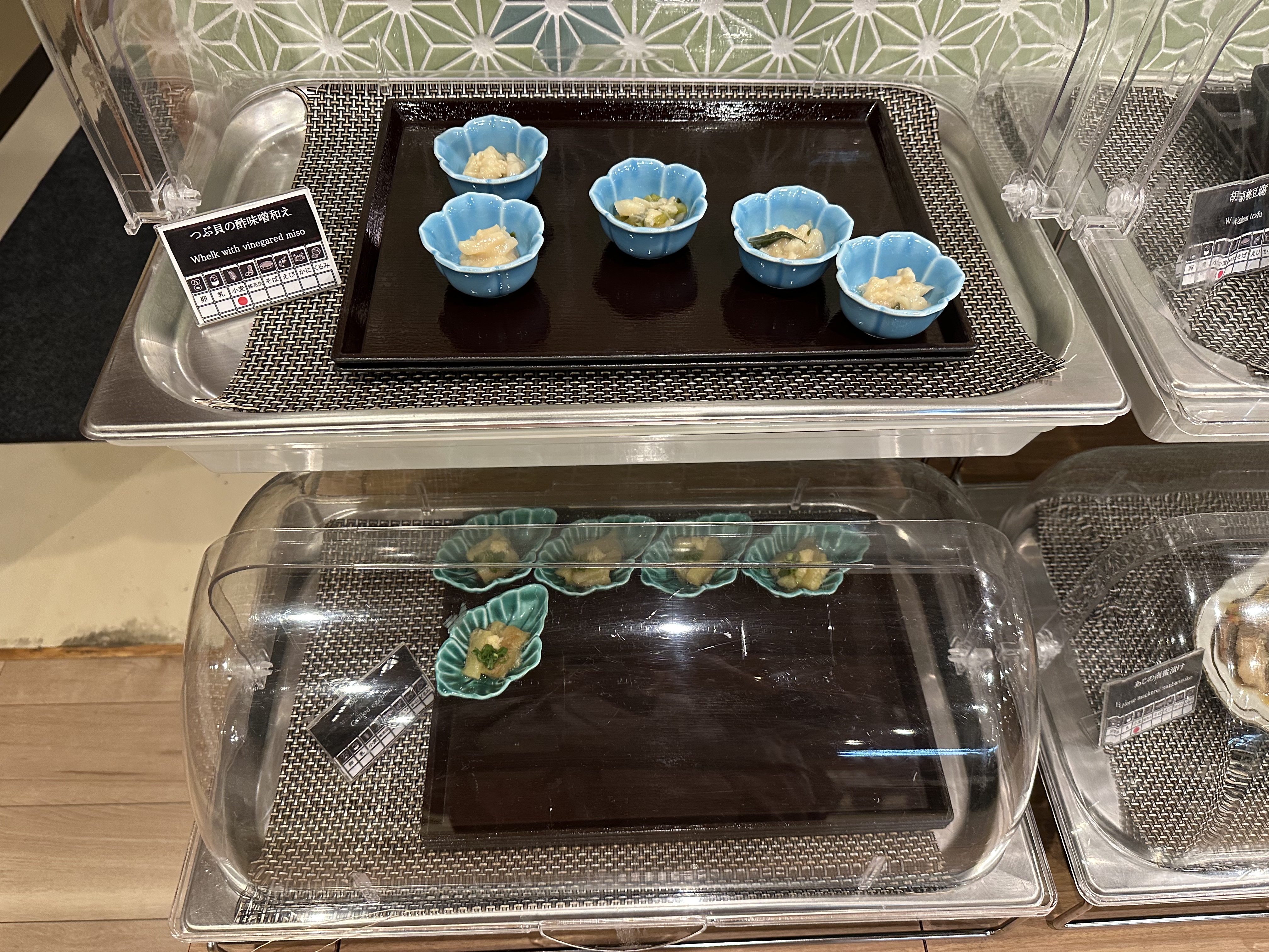 つぶ貝の酢味噌和え (Whelk)、焼きナス (Grilled eggplant)