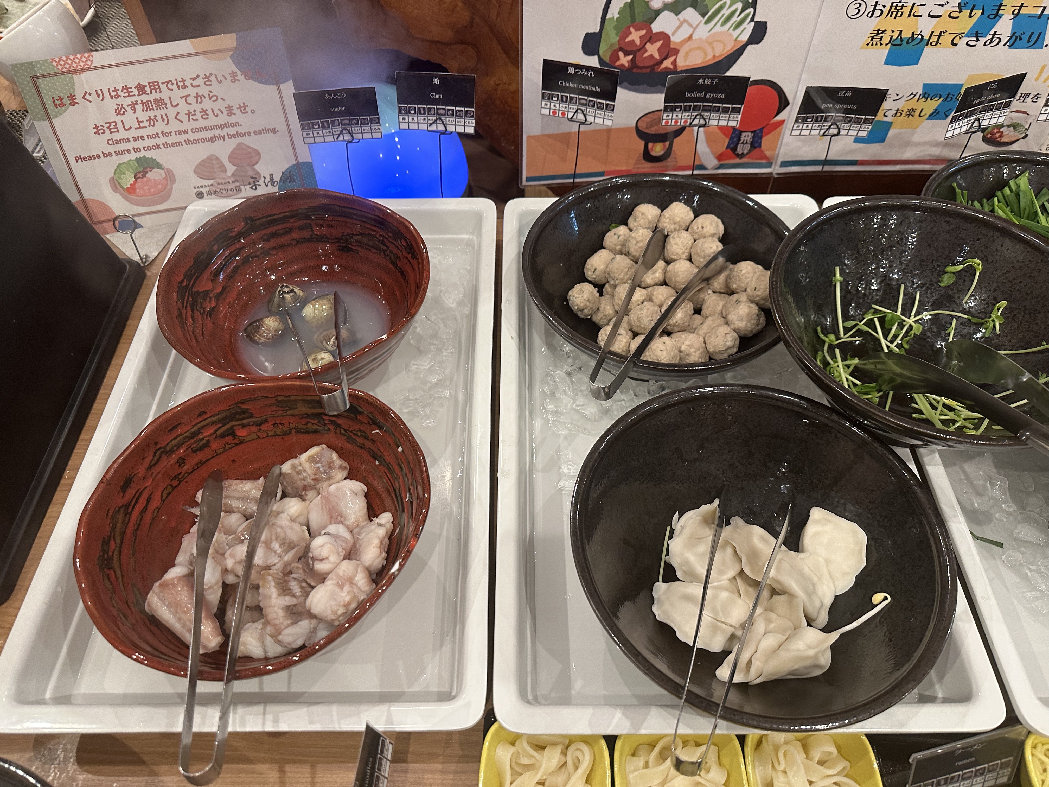あんこう (鮟鱇)、蛤、鶏つみれ (Chicken meatballs)、水餃子、豆苗