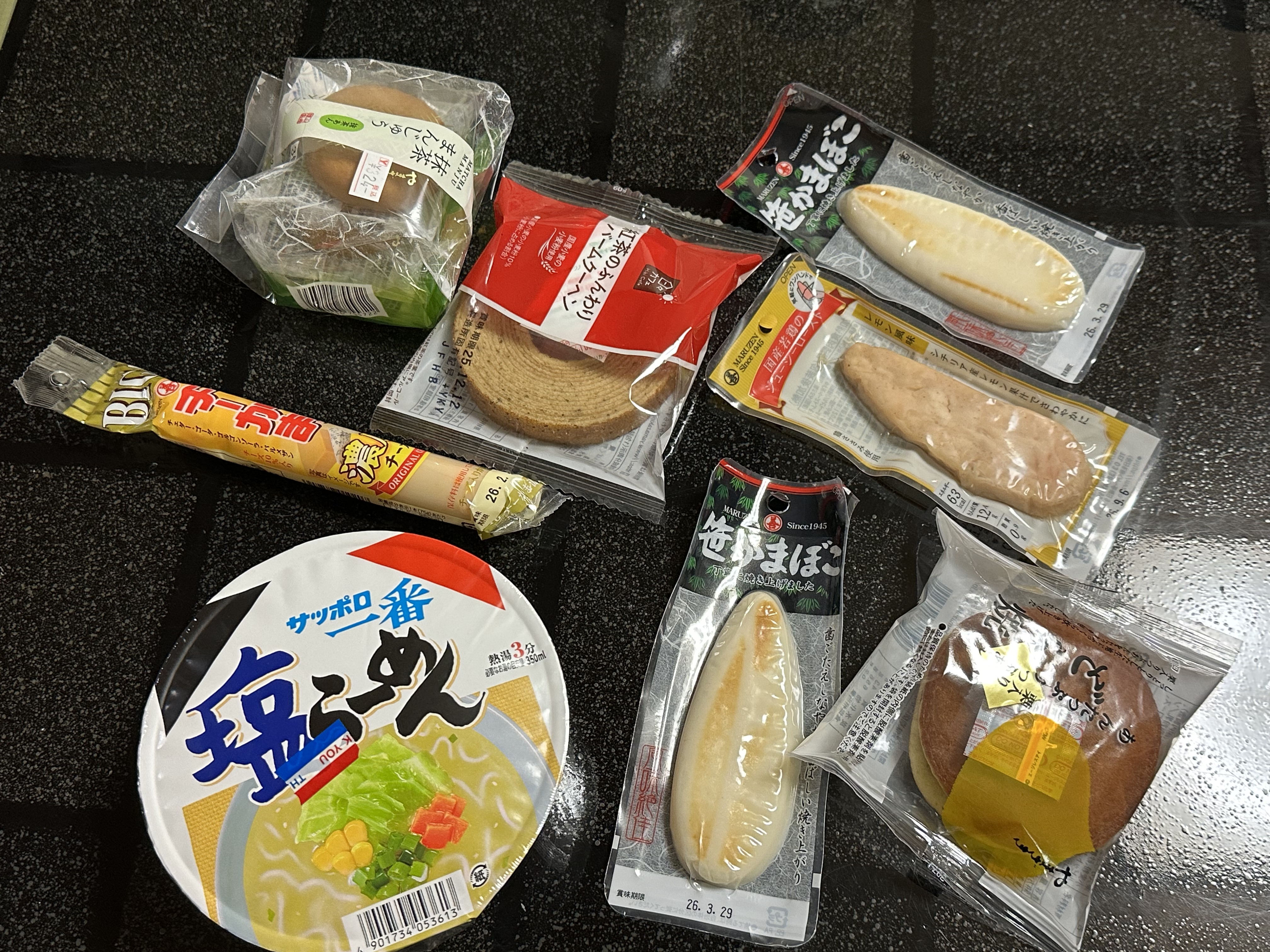 明天早上至午前:抹茶まんじゅう Matcha Manju、紅茶のふんわりバームクーへン (紅茶年輪蛋糕)、笹かまぼこ (烤魚糕)、国産若鶏のヅューンーロスト (烤雞胸肉片)、どら焼 栗入りあんたぶつぶお (栗子銅鑼燒)、塩らーめん (鹽味拉麵)、チーかま (Cheese kamaboko fish paste cake)