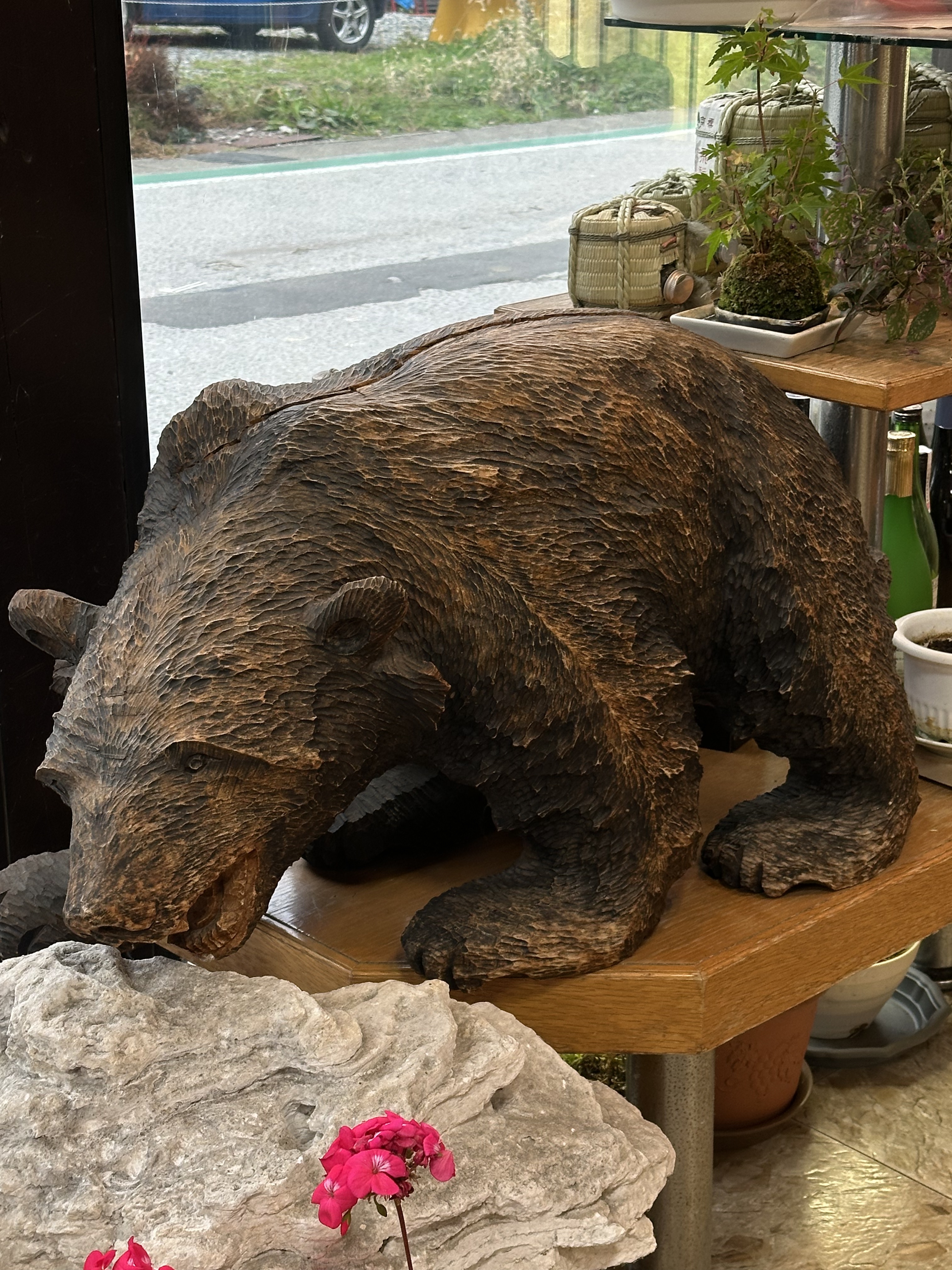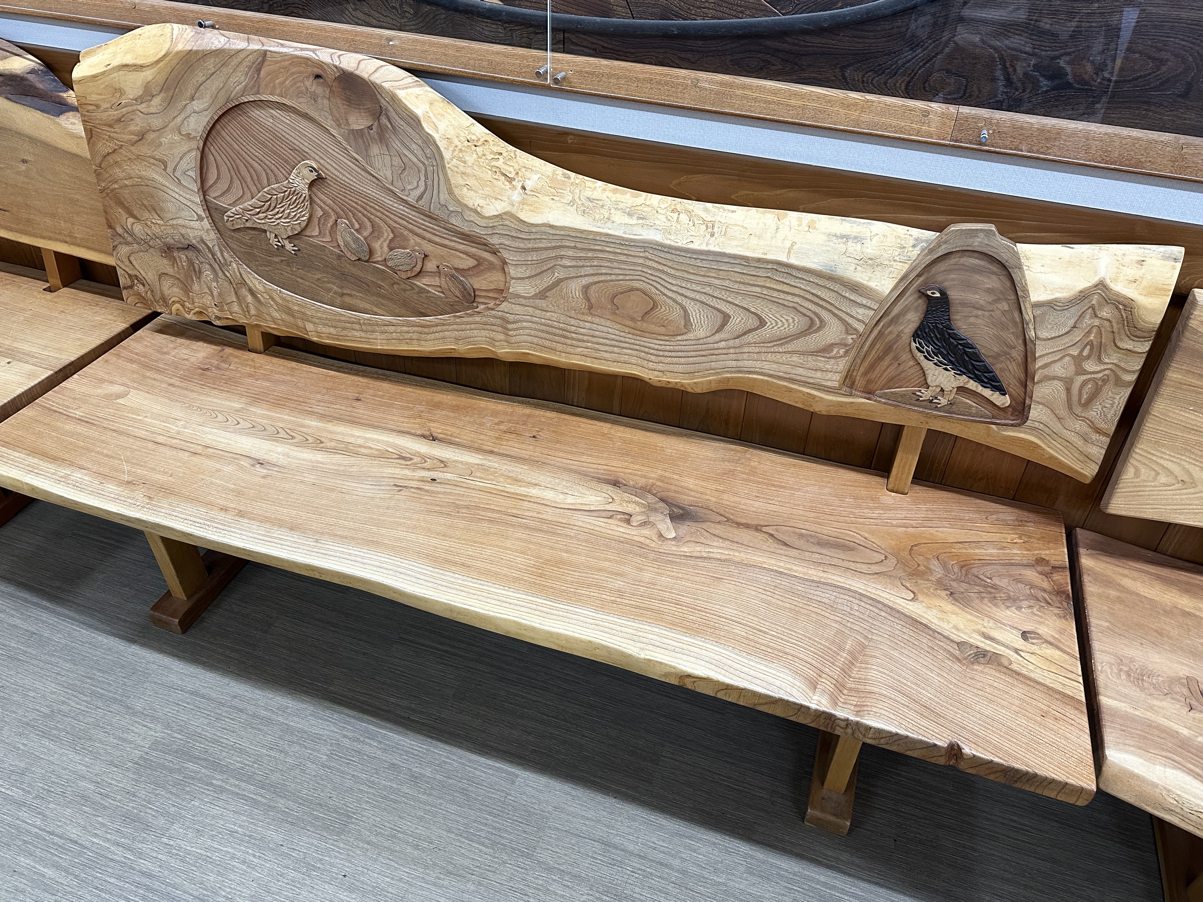 平湯バスターミナル Hirayu Bus Terminal: 木雕長凳