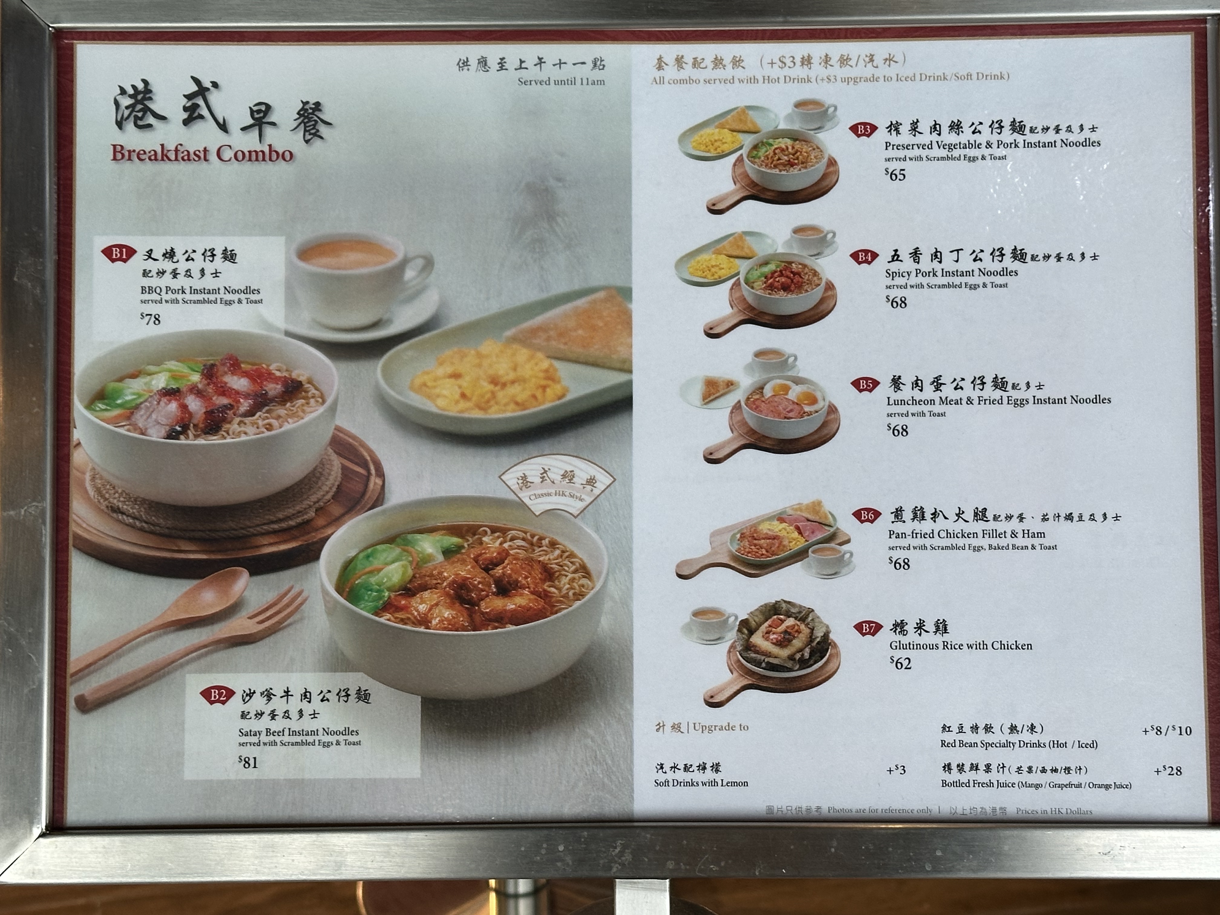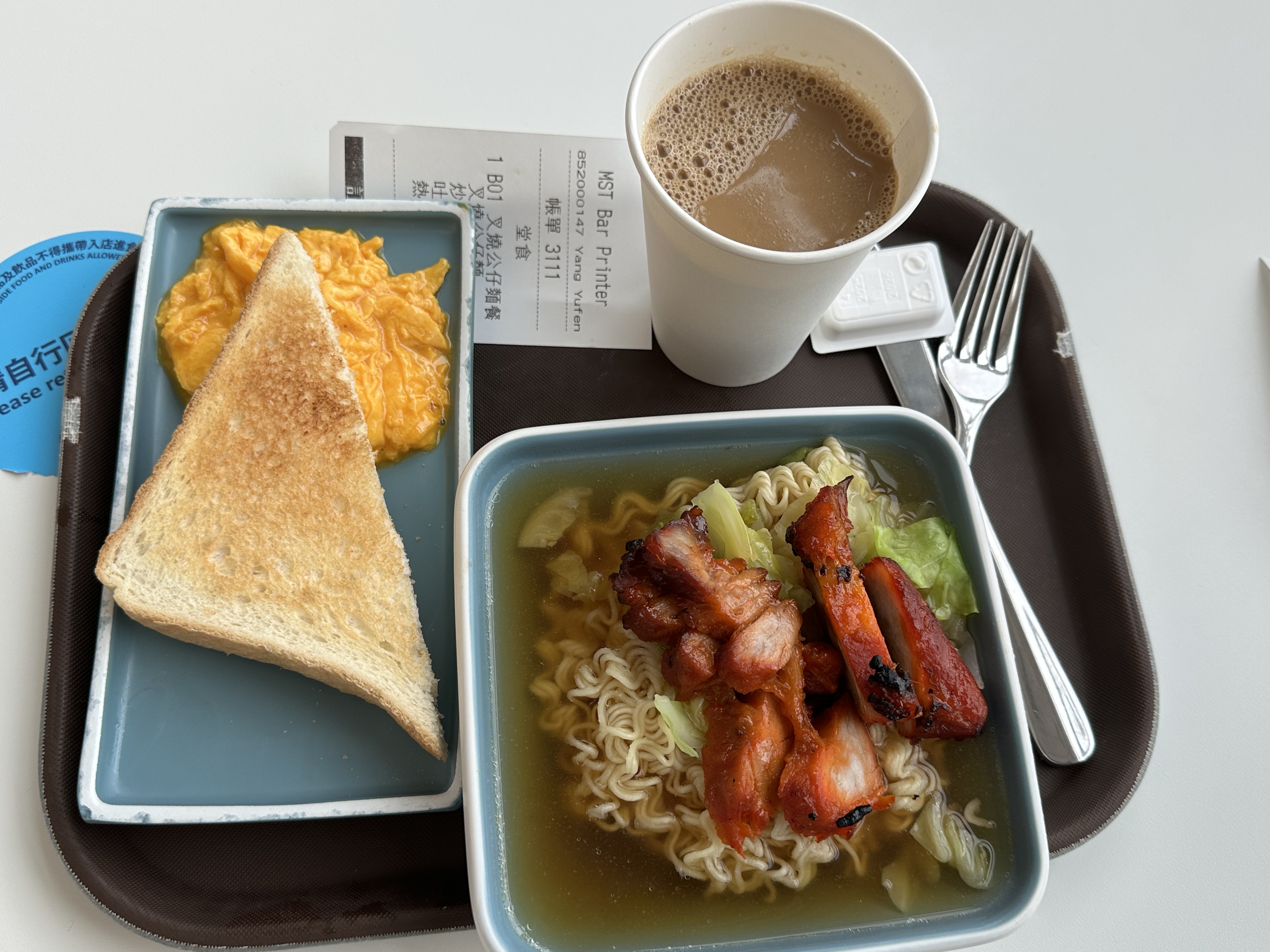 叉燒公仔麵、炒蛋、多士、熱咖啡