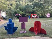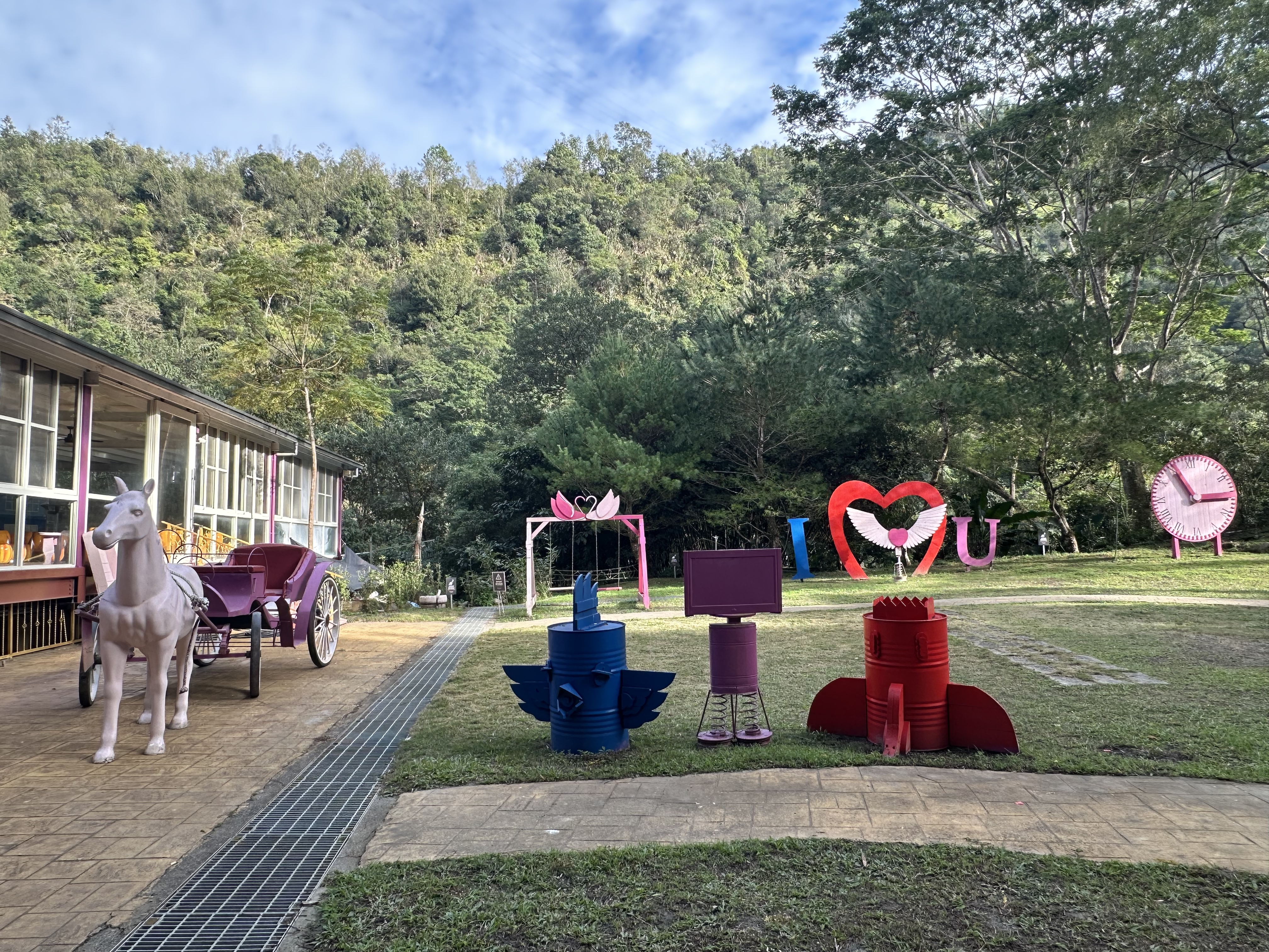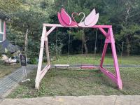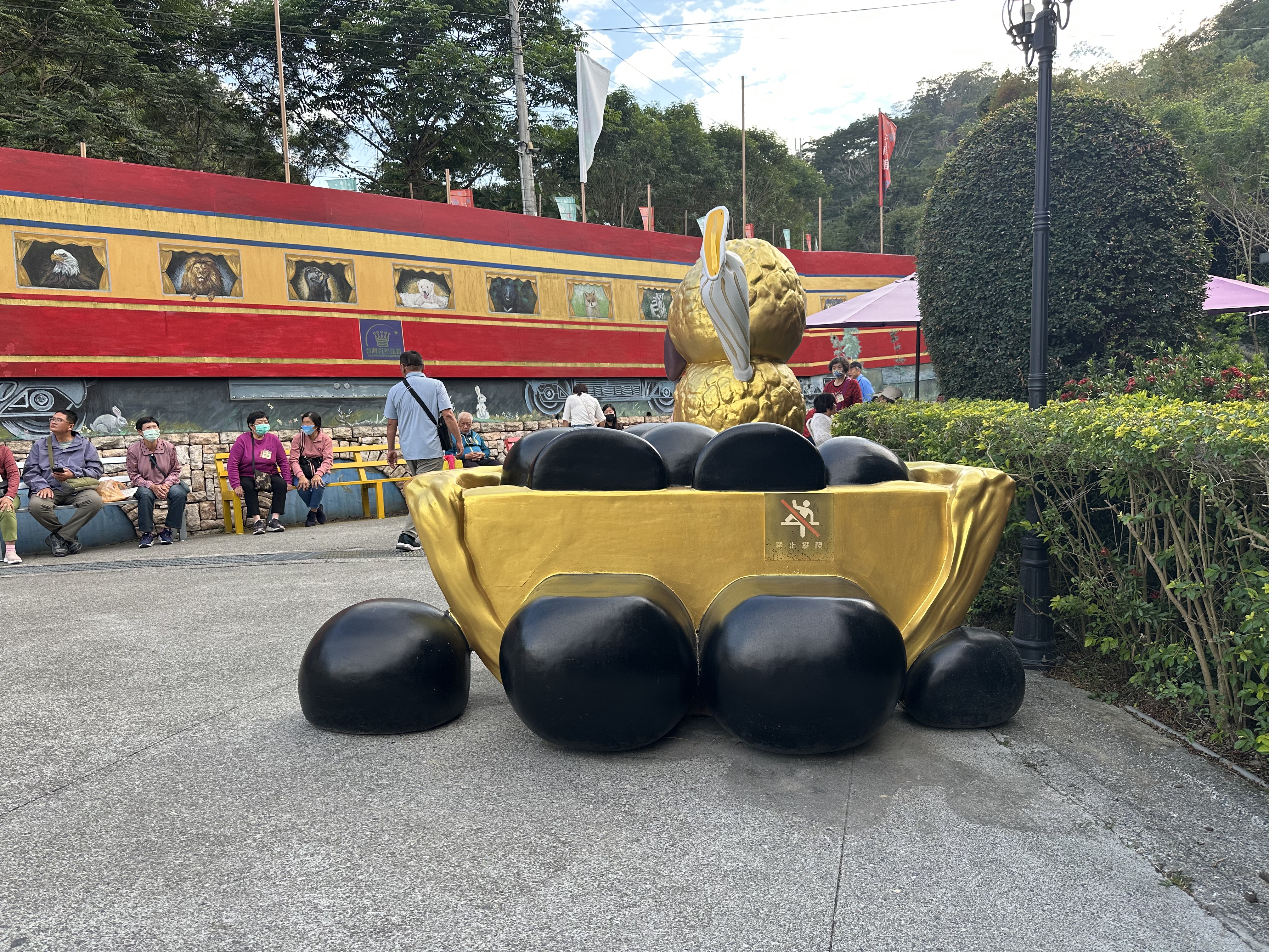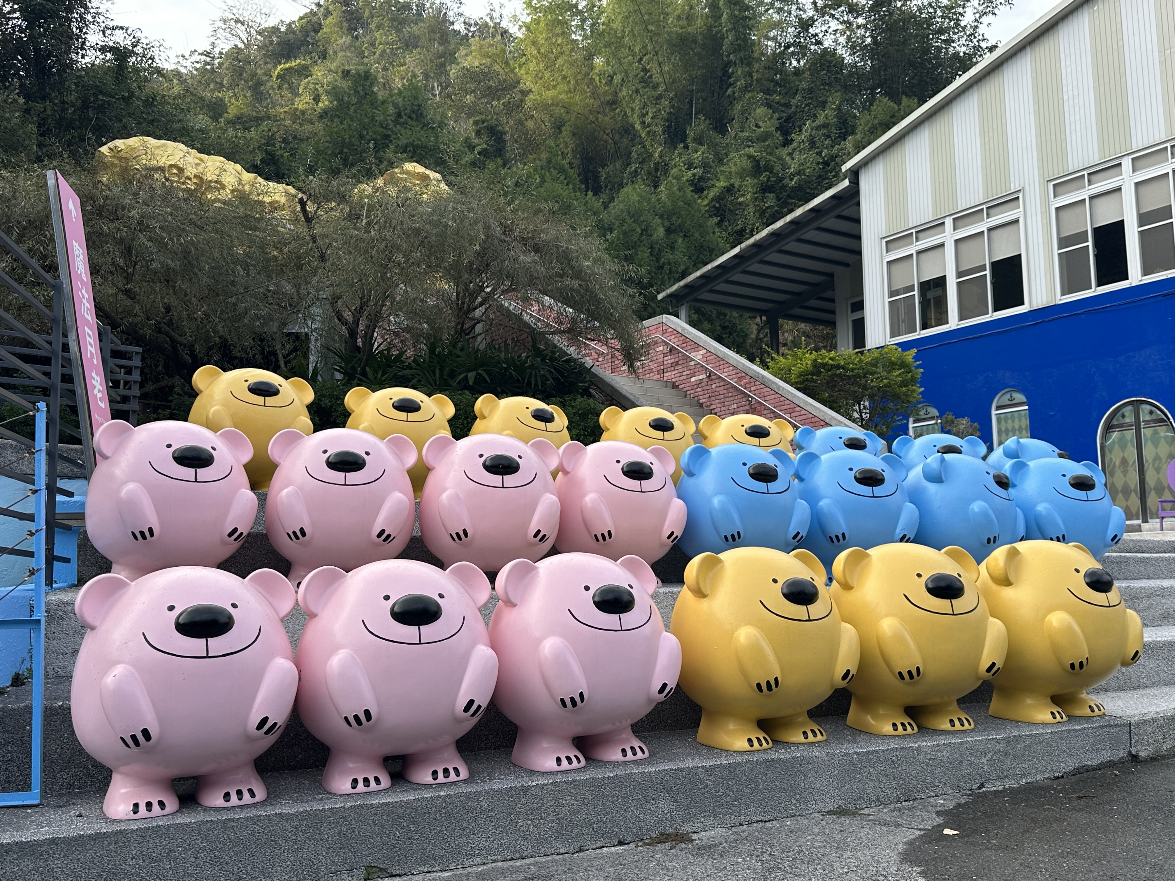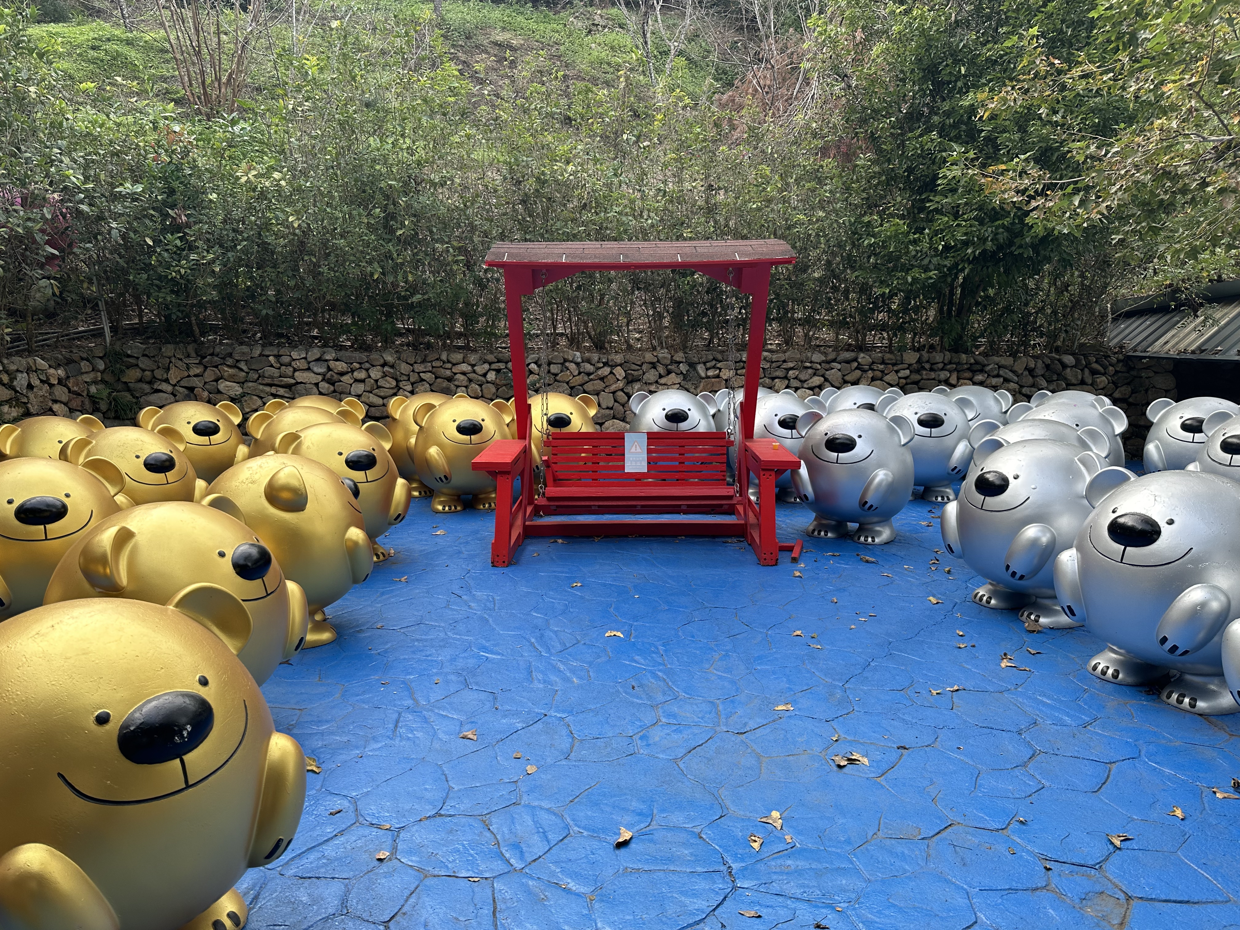 黃銀熊雕塑、鞦韆椅