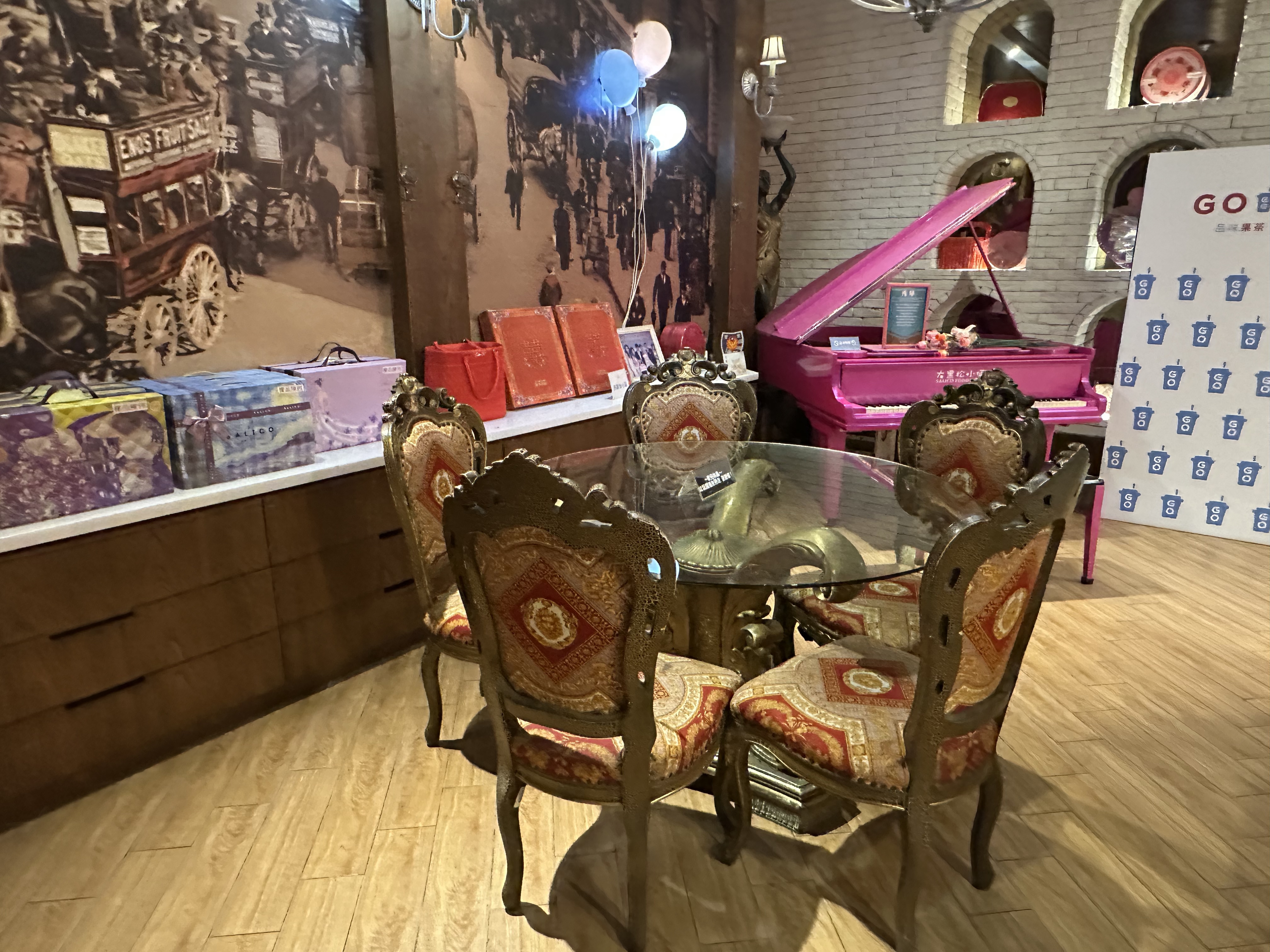 古風枱椅、粉紅鋼琴